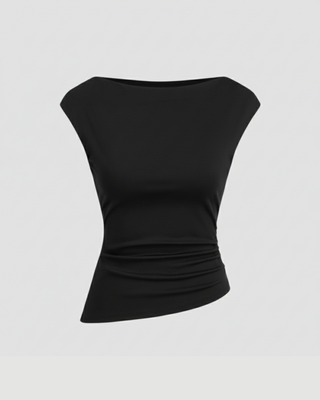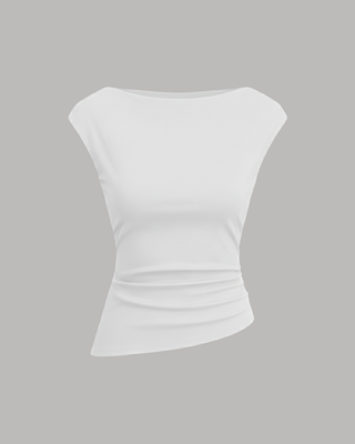 A unique hybrid top blending a conservative boat neckline with an avant-garde, asymmetrical waist. Diagonal ruching pulls the fabric to one side, creating an artistic, draped hemline that elevates it beyond a basic tank.