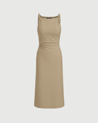 This midi dress offers a perfect balance of modesty and style, featuring a refined boat neckline and a flattering mid-calf length. The ruching throughout the body adds texture and ensures a snug, comfortable fit that moves with the wearer. It is a highly versatile piece that can easily transition from a professional office setting to an evening social hour. The clean lines and sophisticated cut make it a reliable "go-to" dress for a wide range of semi-formal occasions.