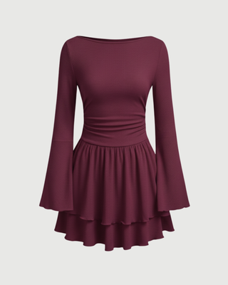 This vintage-inspired mini dress stands out with its dramatic bell sleeves and delicate lettuce-trim ruffles along the hem. The boat neckline adds a touch of 1960s-style elegance, while the all-over ruching brings the look into the modern era. The layered skirt and ruffled edges provide a soft, bohemian texture that feels both whimsical and high-fashion. It is an ideal choice for those who love a "mod" aesthetic with romantic, textural details.