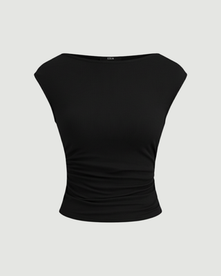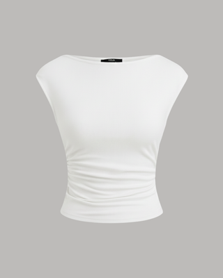 A sophisticated tank top characterized by a draped cowl neckline and a decorative knot detail that cinches the waist. The design incorporates flattering ruching and an asymmetrical hemline, creating a dynamic and modern silhouette suitable for elevated casual or evening wear.