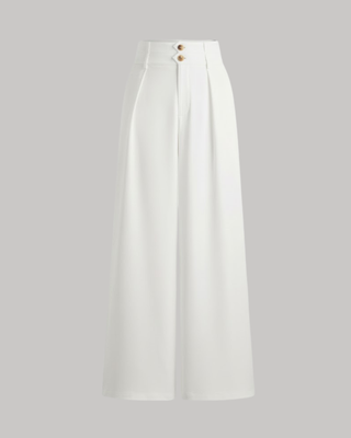 A unique take on the wide-leg trend, characterized by a distinctive multi-button closure at the waist that serves as a built-in accessory. These pants sit comfortably at the mid-waist and flow into a relaxed, roomy leg. The button hardware adds a touch of visual interest, making them perfect to wear with cropped tops or bodysuits that show off the waist detail.