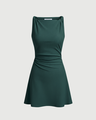 This sleek mini dress utilizes a high boat neckline and a central twist detail to create a sophisticated, draped appearance. The ruching throughout the body provides a textured finish that flatters the silhouette while maintaining a clean, minimalist profile. Its short length is balanced by the modest neckline, making it a versatile piece for semi-formal dinners or cocktail events. The twist detail adds a focal point that elevates the dress from a simple staple to a design-led garment.
