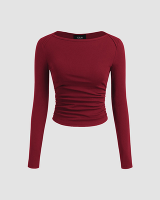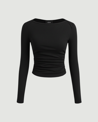 This high-quality basic is made from a dense, stretchy cotton blend that offers a premium feel and long-lasting shape. The wide boat neckline provides a timeless, chic appearance, while the adjustable side ruching adds a contemporary element that allows you to style it as a cropped or full-length top. It is the ultimate layering piece for a clean, minimalist wardrobe.