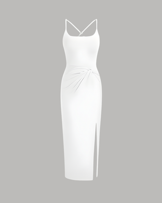 This unique maxi dress centers around an intricate twist and criss-cross detail at the waist, creating a stunning visual "cinch" effect. The deep U-neckline frames the upper body, while the long skirt provides a sophisticated and flowing counterpoint. The architectural wrapping of the fabric adds depth and texture, elevating a simple maxi into a high-design garment. It is an effortless yet impactful choice for summer parties or evening events by the water.