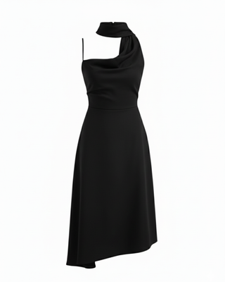 Draped Cowl Neck Ruched Midi Slip Dress - Black