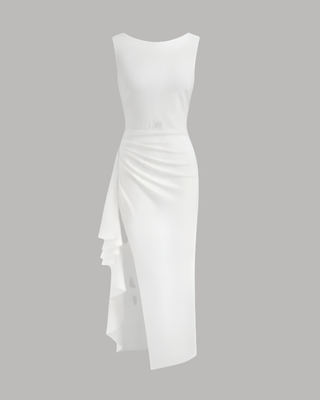 This elegant maxi dress features a sophisticated boat neck and a surprising backless design for a touch of unexpected allure. The ruffled hem and side ruching add a romantic, textured finish to the long silhouette, ensuring beautiful movement with every step. It strikes a perfect balance between being polished and provocative, making it suitable for formal garden parties or weddings. The clean front allows the intricate back and hem details to truly shine as the main features.