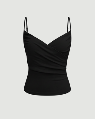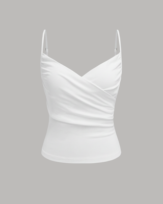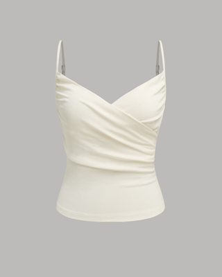 This delicate camisole is designed with a focus on evening wear and romantic styling. It features a deep V-neckline with a crossover wrap-front design that creates a beautiful draped effect. Supported by ultra-thin spaghetti straps, the top is finished with fine ruching along the sides to ensure a snug, body-con fit that emphasizes the natural curves of the body.