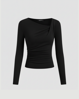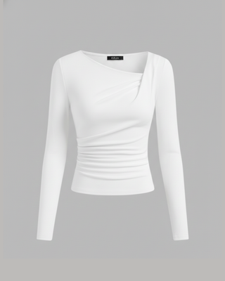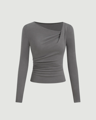 Designed for both style and warmth, this top is constructed from a textured thermal cotton blend that provides extra insulation. The standout feature is the unique asymmetrical neckline that slants across the collarbone, offering a modern twist on the standard long-sleeve. Side ruching provides a custom fit that prevents the thermal fabric from looking bulky, ensuring a sleek, feminine profile.