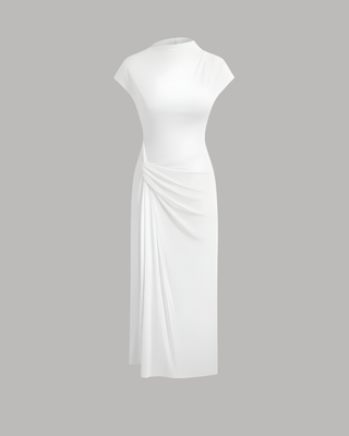 This statuesque maxi dress offers a sophisticated, modest silhouette with its elegant high neckline and floor-length drape. Full-body ruching creates a ripple effect throughout the fabric, adding visual interest and a sophisticated texture to the solid-colored garment. The design emphasizes a long, lean line, making it a powerful choice for formal occasions or evening galas. It pairs beautifully with swept-up hair to showcase the clean lines of the collar and the sleekness of the back.