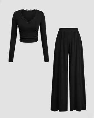 Effortlessly cool and elegant. This set includes a romantic V-neck lace cropped long sleeve top and sophisticated mid-rise wide-leg trousers, perfect for an elevated daytime or evening ensemble.