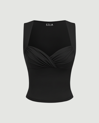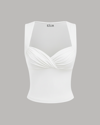 A romantic sleeveless top defined by a heart-shaped neckline and a decorative twist knot at the bust. The fitted design highlights the décolletage, making it a feminine choice perfect for pairing with high-waisted bottoms.