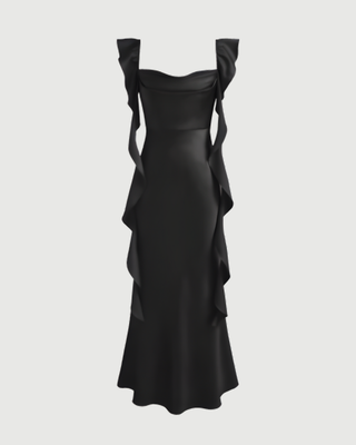 Satin Maxi Dress with Cowl Neck and Ruffle Hem - Black