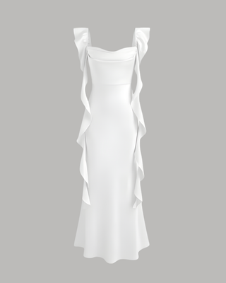 This luxurious maxi dress is crafted from high-shine satin, featuring a soft cowl neckline that drapes beautifully across the chest. The hem is finished with a delicate ruffle, adding a sense of romanticism and fluidity to the formal floor-length silhouette. Its sleek fabric reflects light elegantly, making it an ideal choice for black-tie events or upscale celebrations. The combination of the draped neck and ruffled hem creates a classic "Old Hollywood" glamour feel.