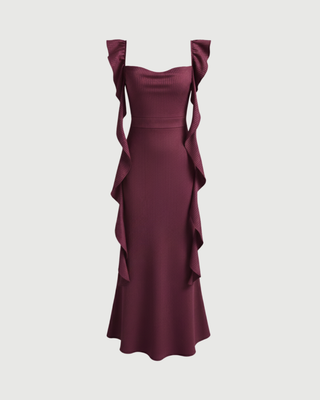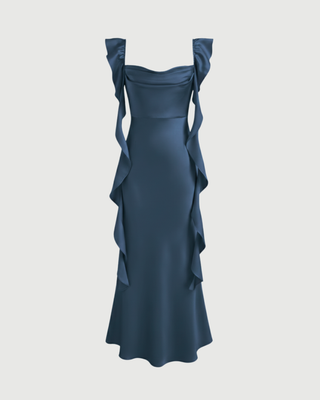 This luxurious maxi dress is crafted from high-shine satin, featuring a soft cowl neckline that drapes beautifully across the chest. The hem is finished with a delicate ruffle, adding a sense of romanticism and fluidity to the formal floor-length silhouette. Its sleek fabric reflects light elegantly, making it an ideal choice for black-tie events or upscale celebrations. The combination of the draped neck and ruffled hem creates a classic "Old Hollywood" glamour feel.