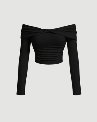 A fashionable long-sleeve top defined by a wide off-shoulder neckline and a central twist-knot detail at the bust. The pleated or ruched fabric adds texture to the chest area, creating a romantic and feminine vibe.