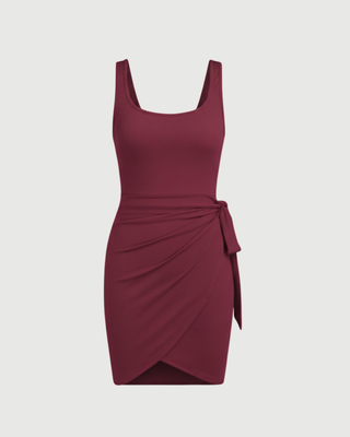 This playful mini dress features a wide U-shaped scoop neck that opens up the chest and shoulders for a fresh, youthful look. The decorative knot at the center of the bodice adds a focal point that breaks up the solid color and enhances the bust line. It is a charming and effortless piece that works exceptionally well for weekend gatherings or casual summer celebrations.