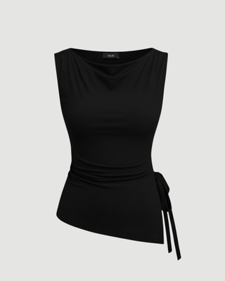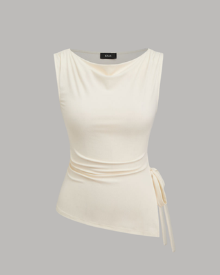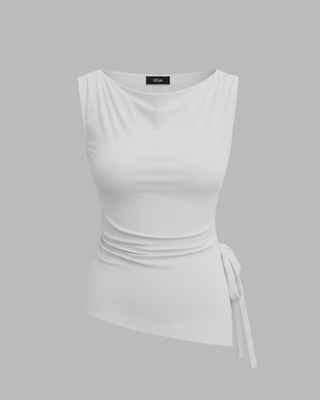 A sleeveless tank top crafted from a soft, textured knit fabric for added comfort. It features a modern asymmetrical neckline that creates a diagonal line across the chest, paired with side ruching for a fitted and flattering silhouette.